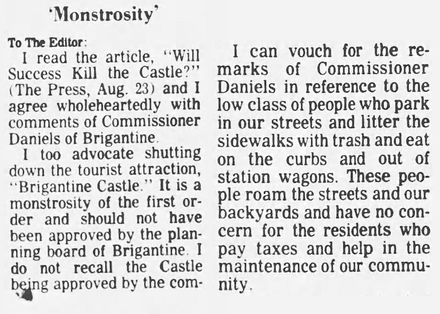Some in the town didn’t appreciate the influx of tourists, especially because they didn’t feel like they were included in the decision-making around its approval and construction. The complaints are valid and easy to understand. I grew up in a town that eventually added multiple malls and the number of cars randomly driving through our neighborhoods, lost or trying to find a back-way into a shopping center caused constant headaches for locals. Much like with our malls though, Brigantine Castle had already been built and was attracting crowds that didn’t really have any incite into local opinion. Here are some highlights from a letter written to the local paper in the summer of 1977.