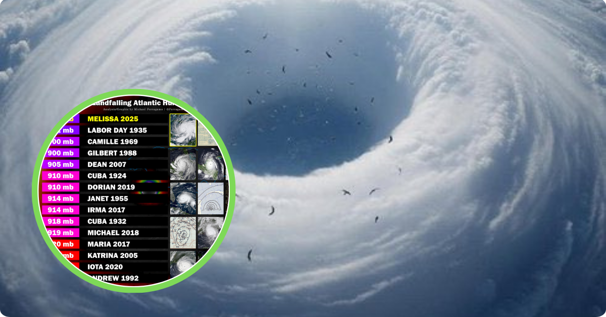 Hurricane Melissa roared ashore over western Jamaica at 1 p.m. EDT on October 28 as a high-end Category 5 storm, with 185 mph winds and a central pressure of 892 mb. The storm ties Melissa with the 1935 Labor Day Hurricane as the strongest landfalling Atlantic hurricane on record. For Jamaicans, the destruction exceeded previous disasters, with catastrophic flooding, storm surge, and landslides across the western half of the island. Hurricane Melissa is now considered one of the most powerful storms in Atlantic history.