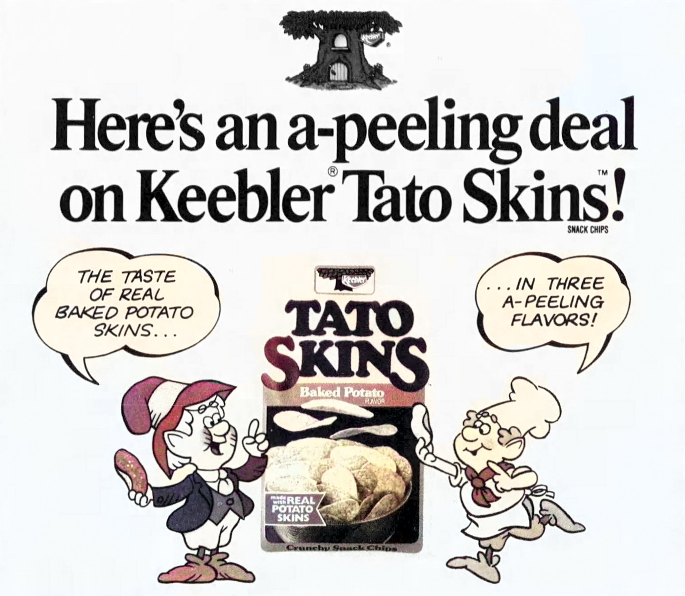Keebler was known for cookies at the time, but the salty snack market was hard to ignore. By 1984, the U.S. salty snack market was worth more than $6.1 billion in retail sales, and sales were growing by double digits. This was not their first step into that world. Since 1980 they had been making Butter Flavored Pretzels and Krunch Twists, but Tato Skins were something different.
