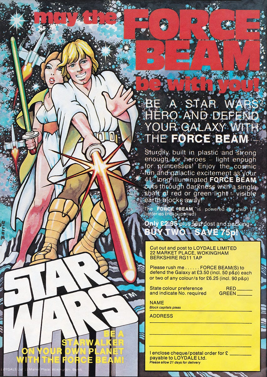 But that was just in the US, in Britain, the toy reached children through Loydale Limited of Wokingham. Beginning in 1978, Star Wars Weekly famously carried full page mail order ads offering a 41 inch illuminated Force Beam for £2.95 plus postage. The ads leaned heavily on Star Wars imagery, even showing Luke and Leia lookalikes in early versions, before shifting to more generic artwork after what seems to have been legal pressure. Like the Levin distributed U.S. examples, these UK Force Beams do not carry any “Made in” marks or Durham branding. All that can be confirmed is that Loydale acted as the seller and promoter, which makes it likely but not proven that the UK stock came from the same supply chain Levin was using in the States.