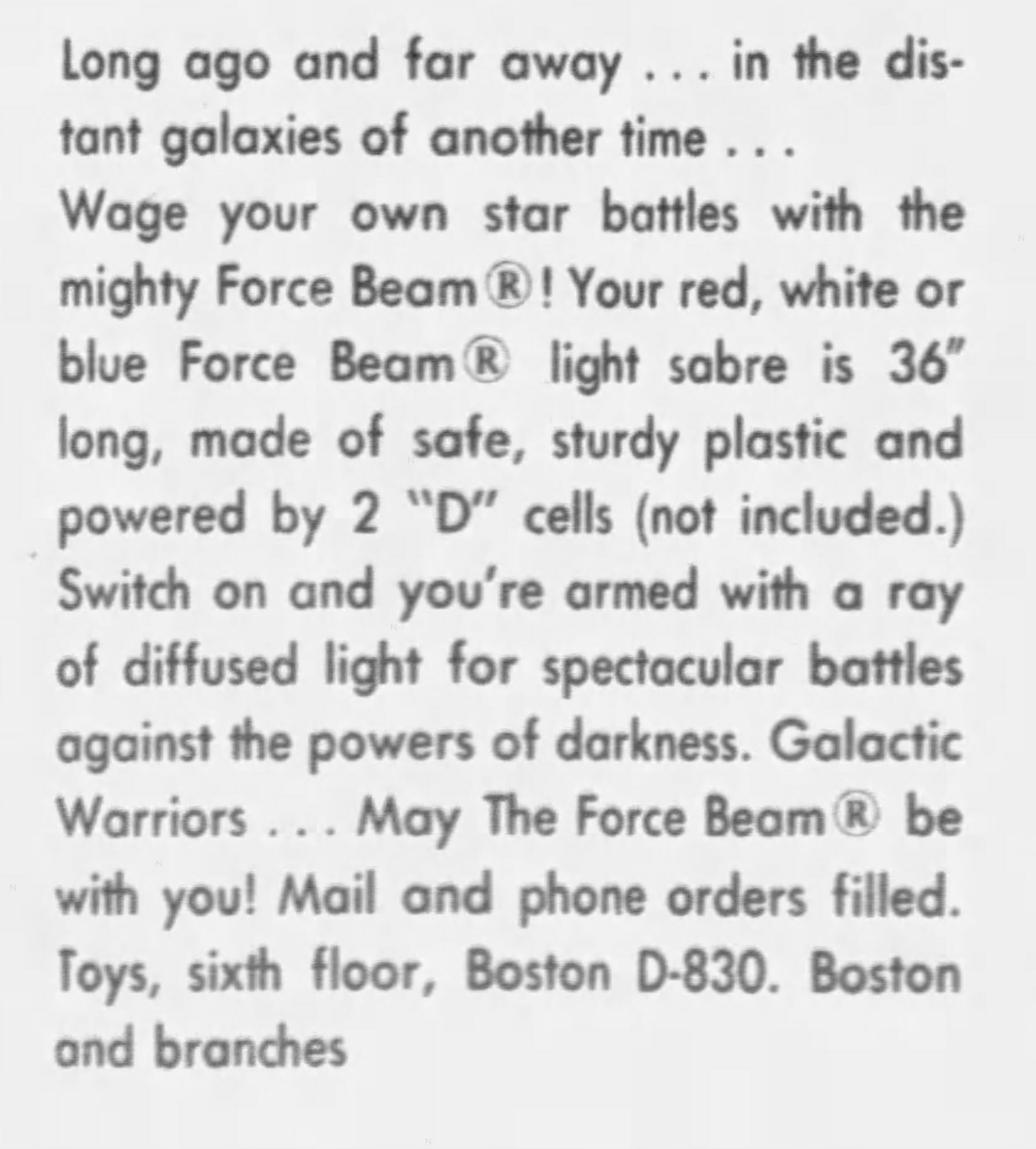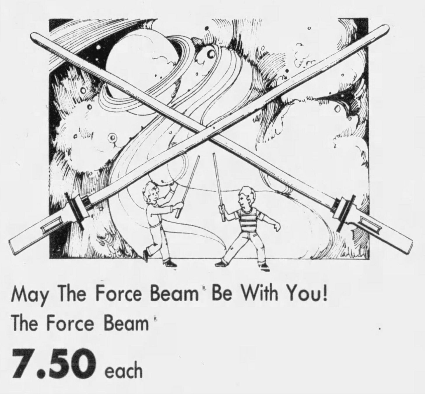 I still remember when my sister spotted the Force Beam toy in a newspaper ad right around the time Star Wars first came out. She held the paper up and showed me, pointing at the photo with a smile because she knew how much I was obsessed with the movie. The ad made it look like the closest thing you could have to a real lightsaber. While the ad was black & white, it still appeared to glowing and dramatic in a way that seemed almost magical to me then. From that moment the image stuck in my head, and I kept going back to it again and again, staring at the paper and imagining what it would feel like to hold one, to actually hold a lightsaber. As Christmas drew closer, I quietly held onto the hope that it would show up under the tree, thinking that if I was lucky enough to get it, there would be no better gift in the world.