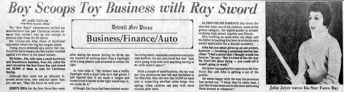 At the same time, American kids could also find very similar toys from other quick-moving companies. One called the Star Beam, made domestically by Durham Industries, Inc. in New York and marked “Made in U.S.A.” in 1977. But these were just the tip of the of fake lightsaber iceberg. Prepare to be inspired by John Joyce, a 12 year old, who with his father managed to get 20,000 of his Star Force Rays on shelves by Christmas.